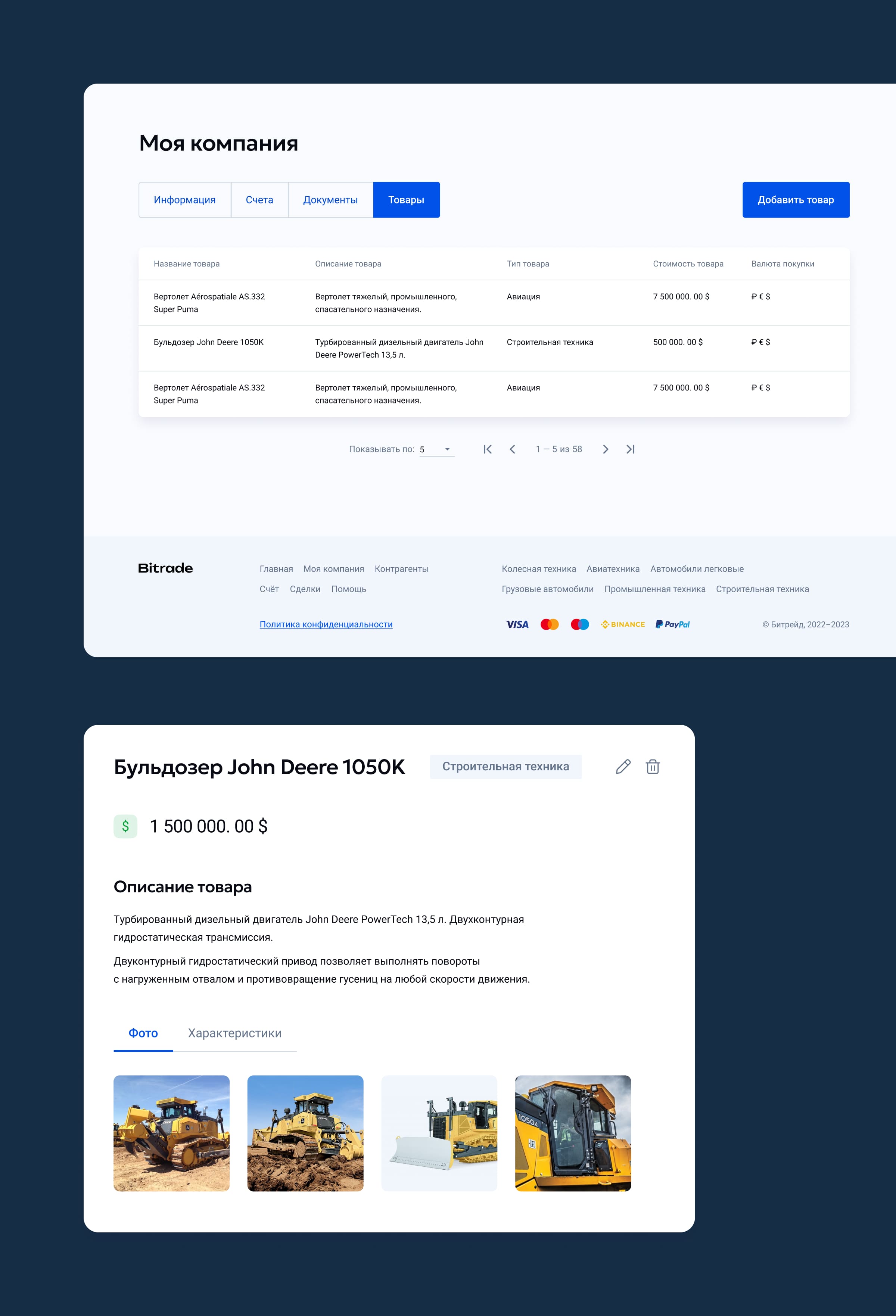 В этом разделе клиент может загружать документы, управлять своими счетами, добавлять товары на экспорт.