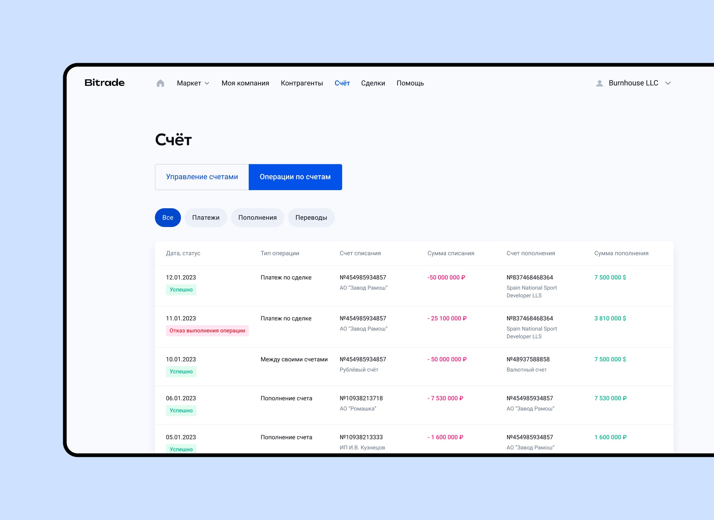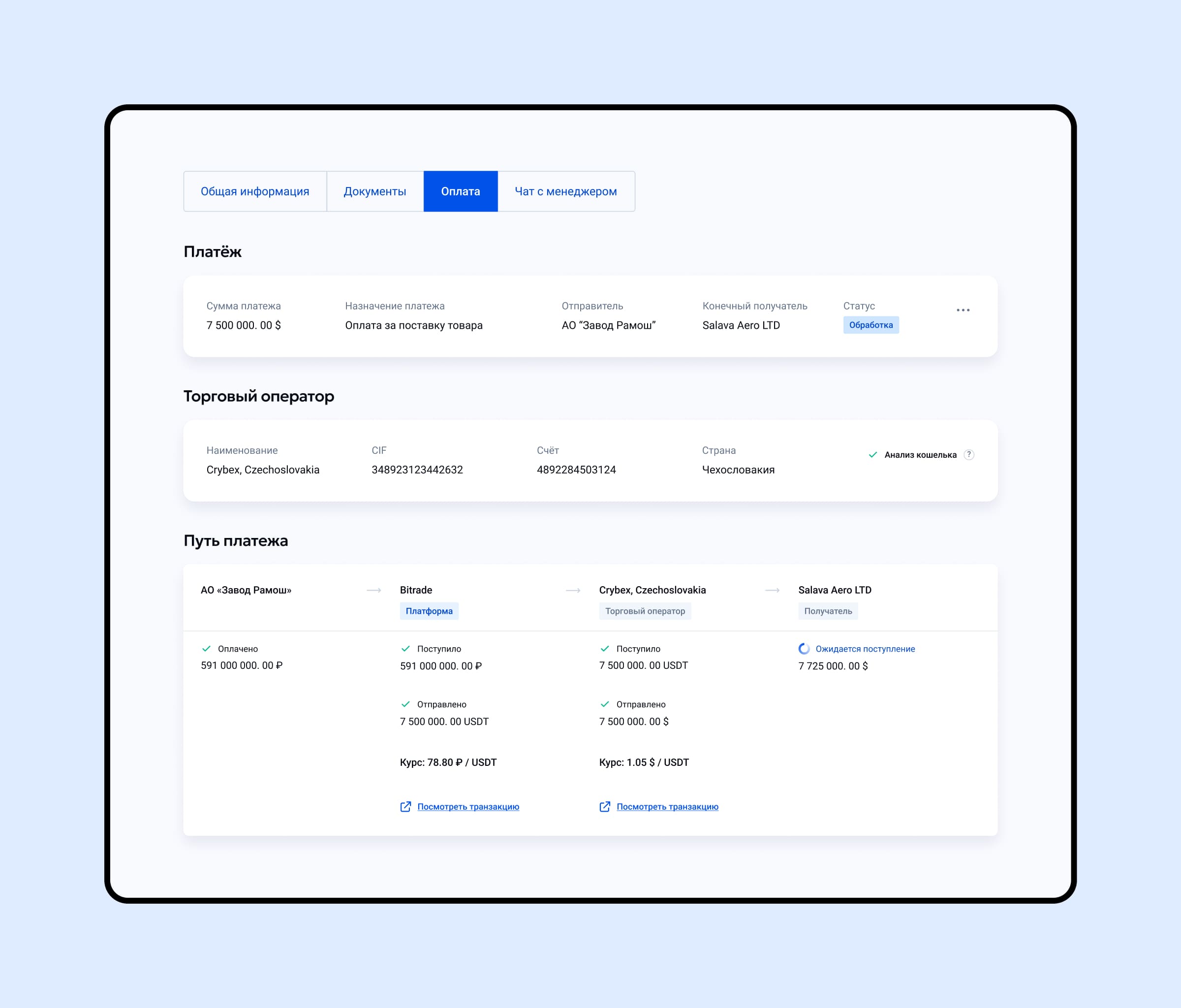 На протяжении всей сделки клиент может отслеживать путь платежа до покупателя, а также посмотреть транзакции.