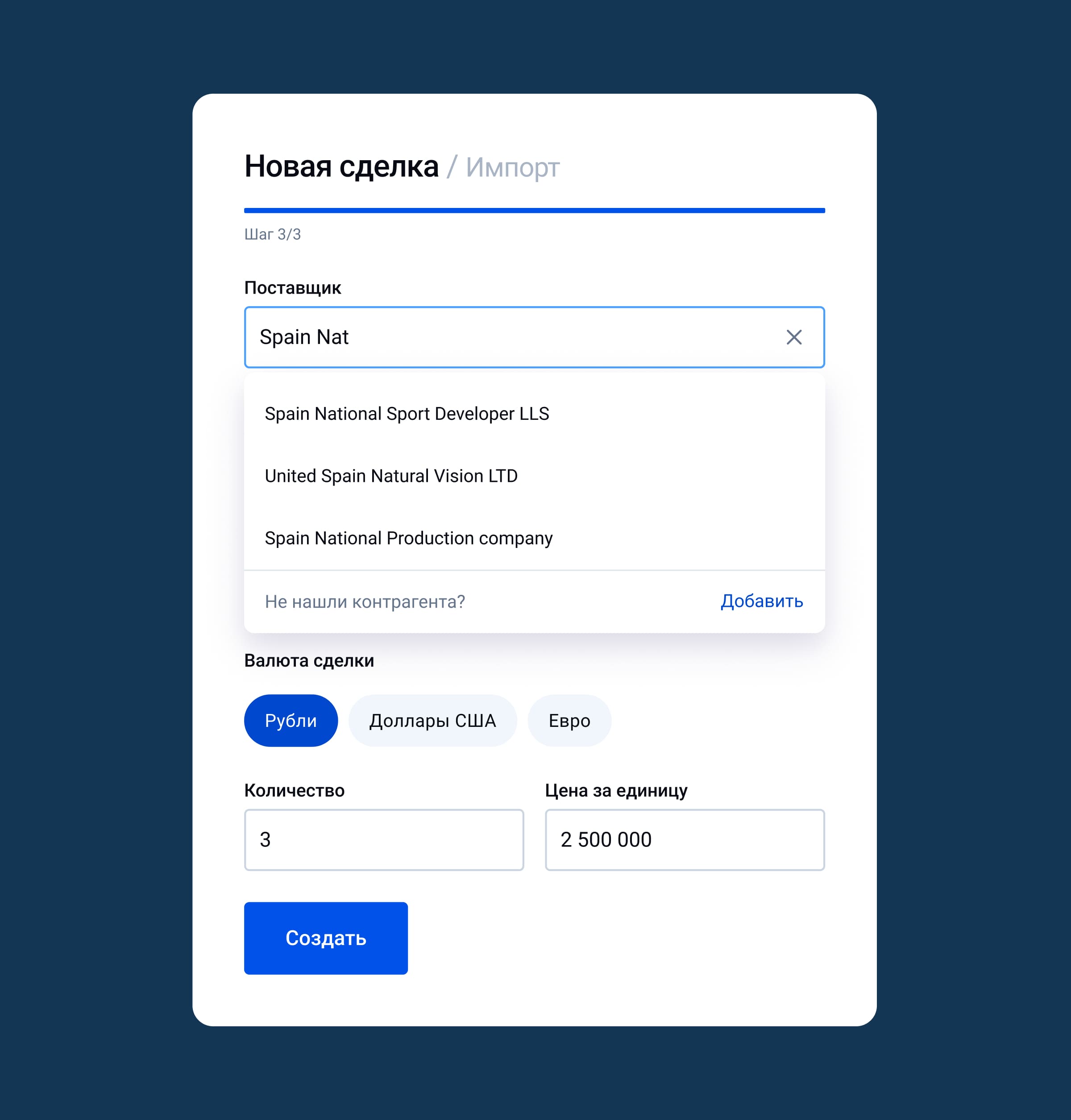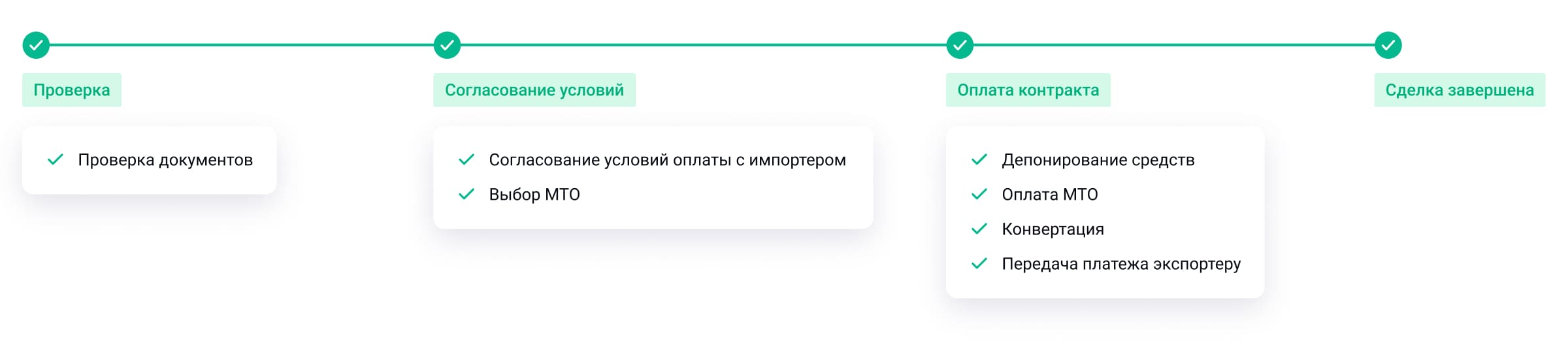 В MVP предполагается два типа сделок: импорт и экспорт. Платежная схема практически одинаковая, только работает в разные стороны в зависимости от типа.