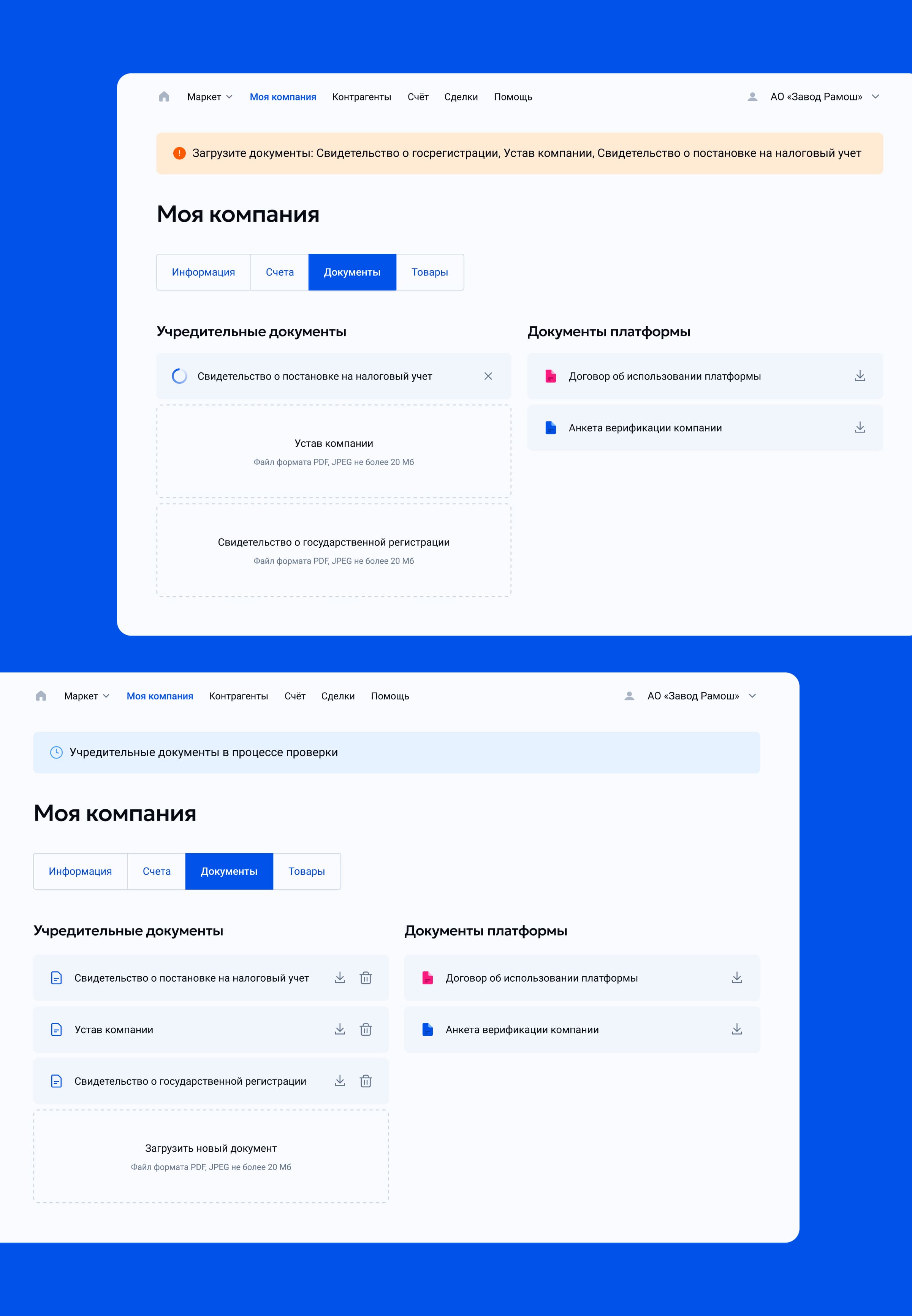 Выводим плашку, напоминающую про загрузку документов. После загрузки необходимых документов, сменяем её на плашку со статусом «На проверке».